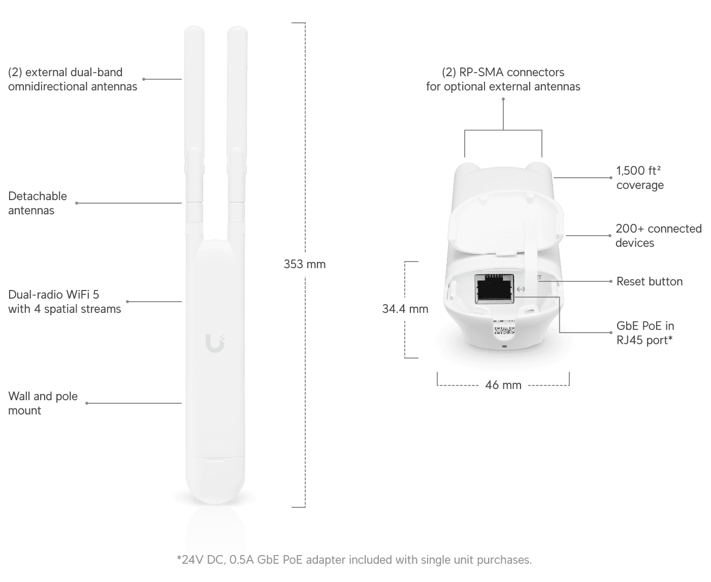 Compact, indoor/outdoor WiFi 5 AP with 4 spatial streams and optional external antenna support for directional coverage.
