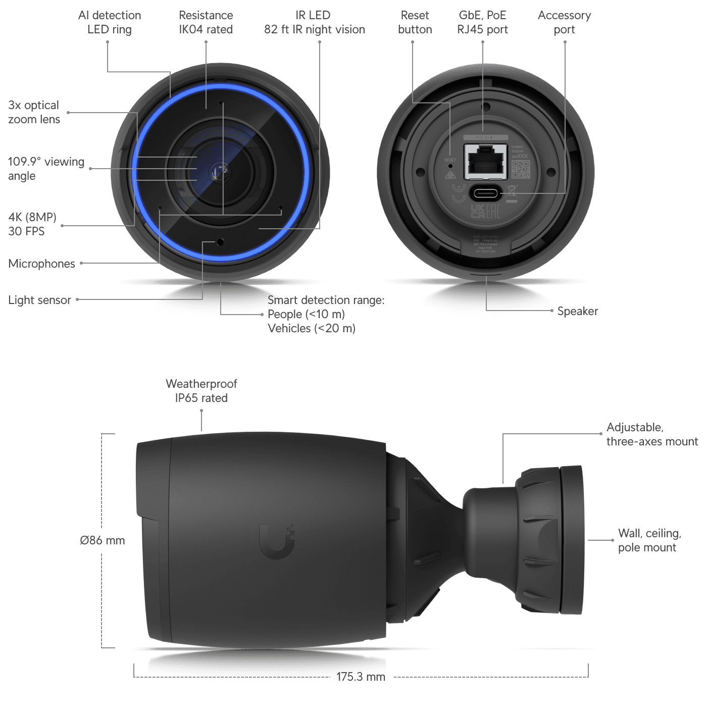 Indoor/outdoor 4K PoE camera with 3x optical zoom, long-range IR night vision, and enhanced AI detection capabilities.