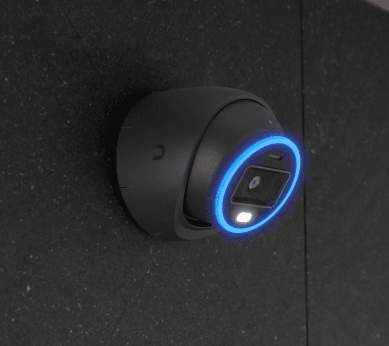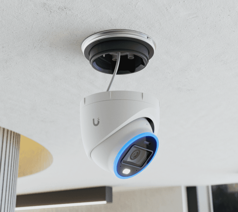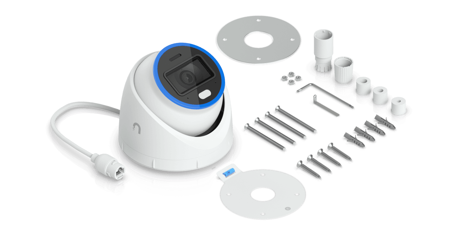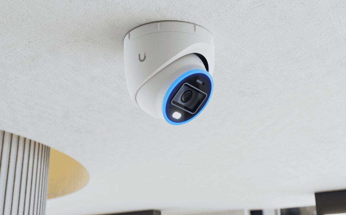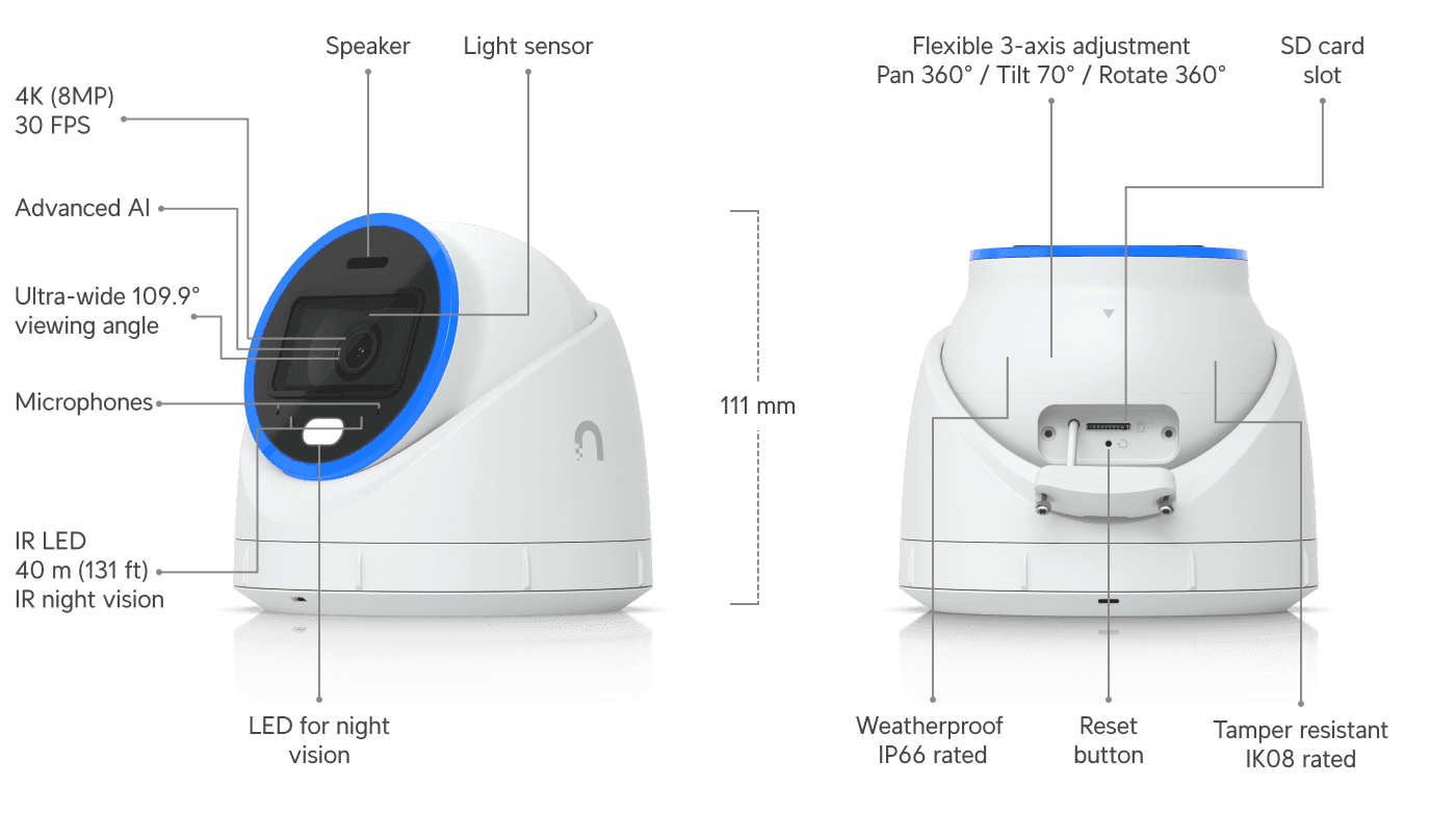 All-weather, vandal-proof 4K PoE+ turret camera with enhanced AI capabilities and IR and visible LEDs for night vision.