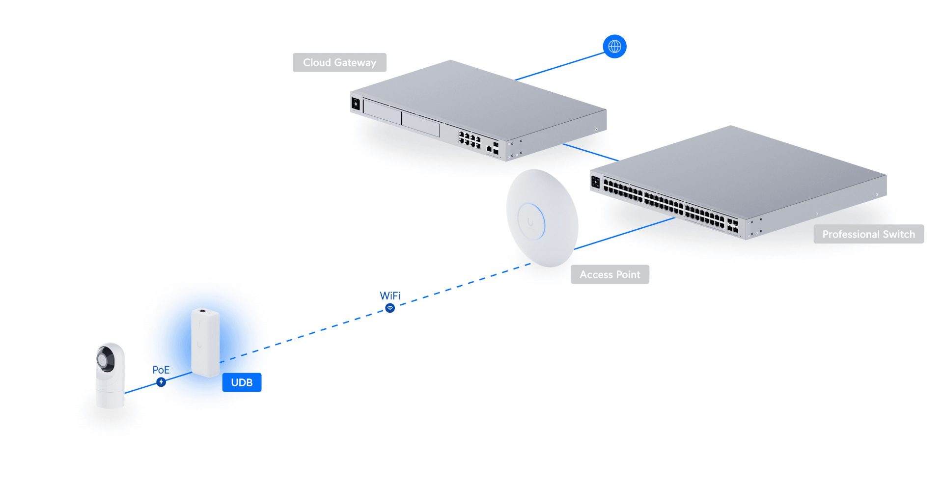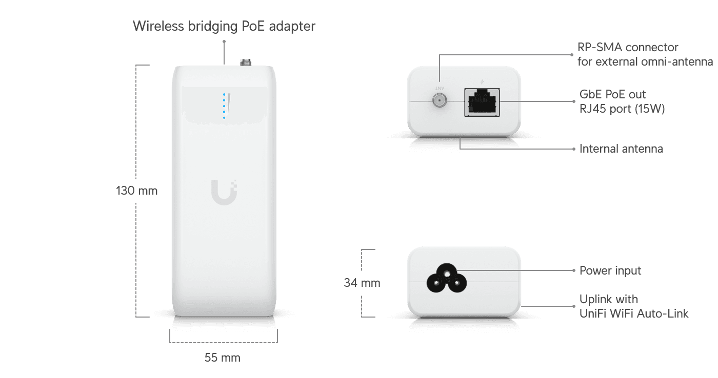 Plug-and-play, wireless bridging PoE adapter with integrated UniFi WiFi Auto-Link.