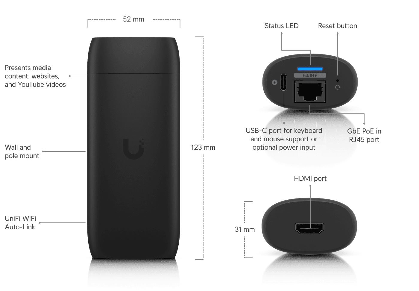 Note. USB-C power adapter and HDMI cable not included. Does not support Protect camera streaming. Use Protect Viewport to view Protect camera feeds on an HDMI display.