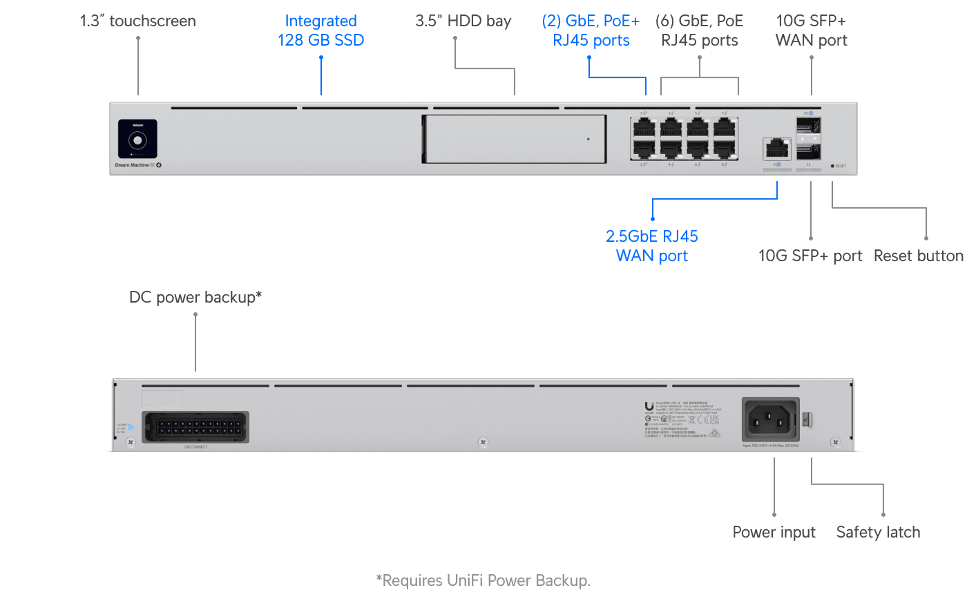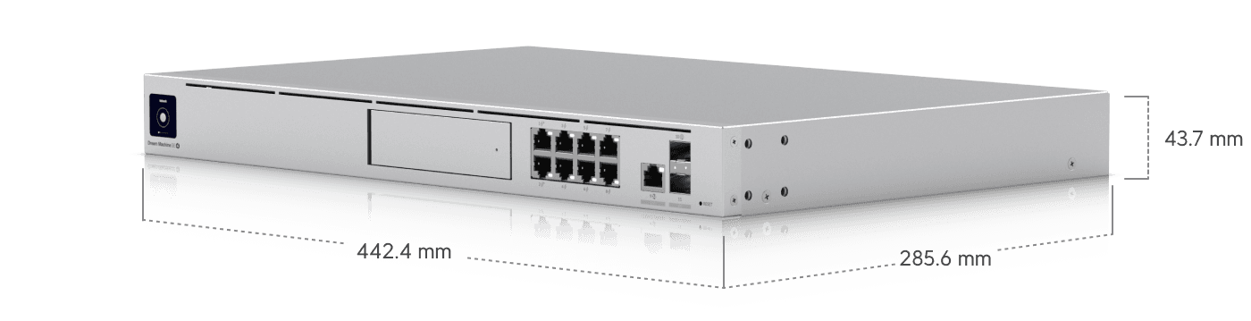 10G Cloud Gateway with 100+ UniFi device / 1,000+ client support, 3.5 Gbps IPS routing, and built-in PoE switching.