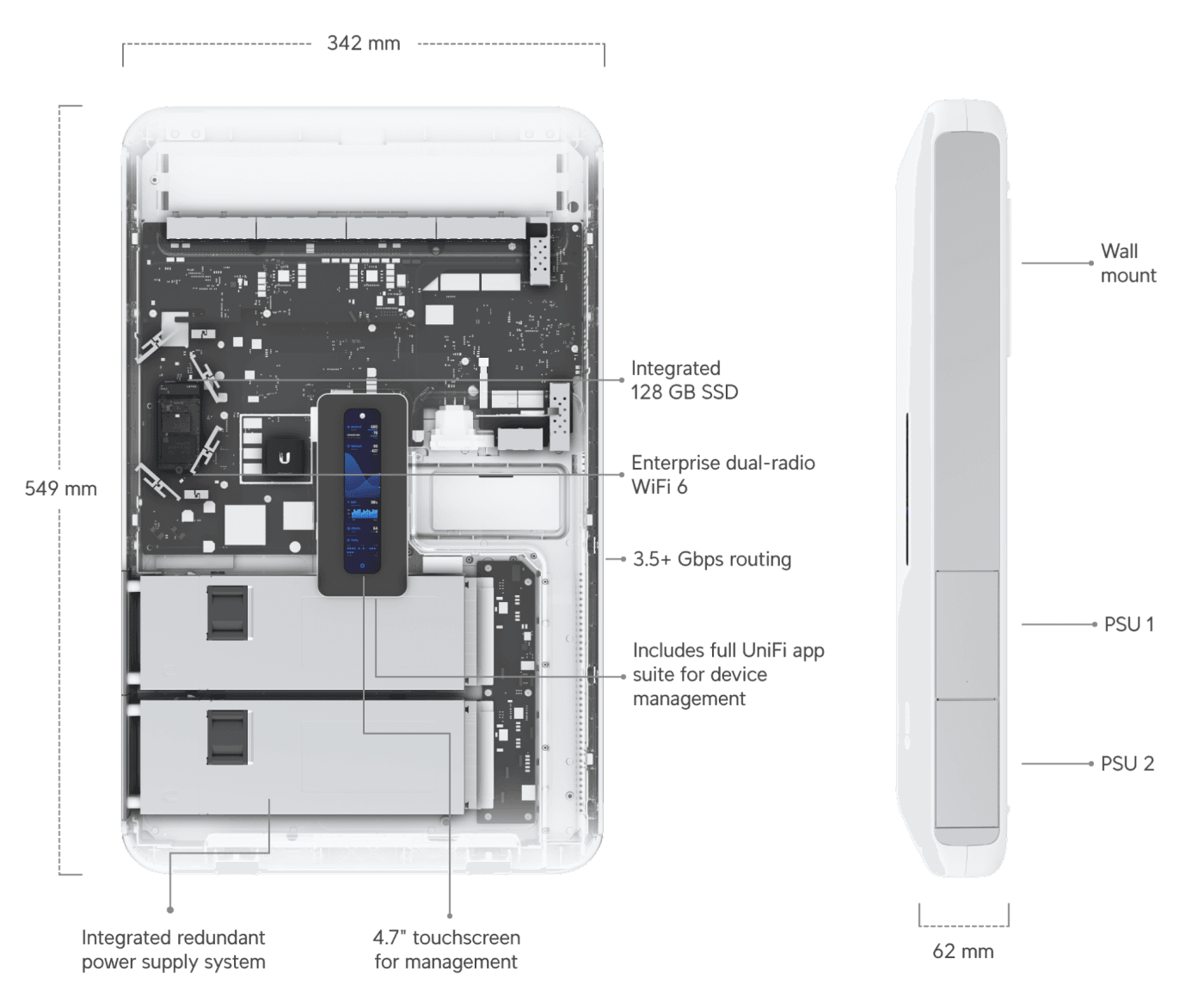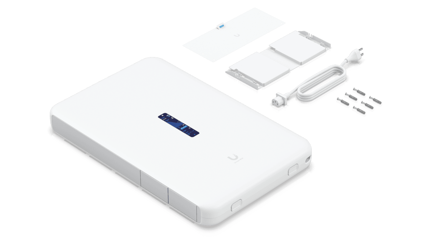Wall-mounted 10G Cloud Gateway with integrated WiFi 6, high-power PoE switching, and full UniFi application support.