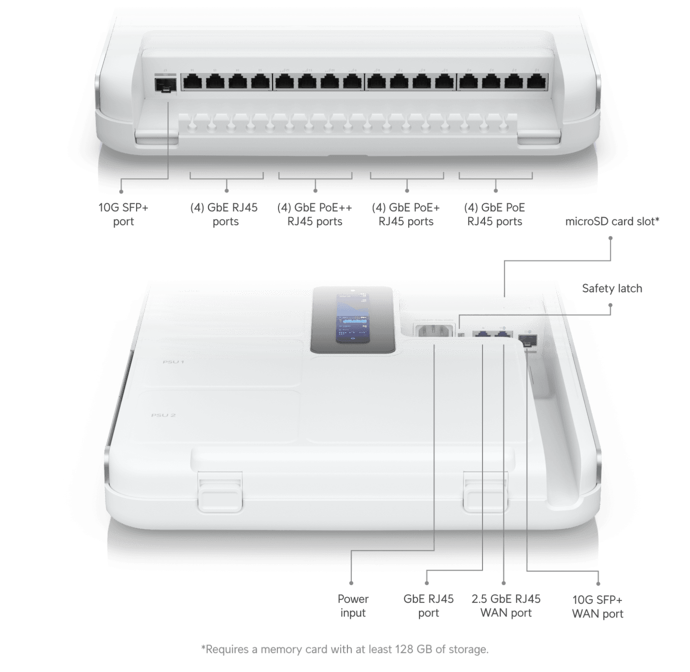 (1) 10G SFP+*, (17) GbE RJ45 LAN ports including (4) PoE++, (4) PoE+, and (4) PoE ports