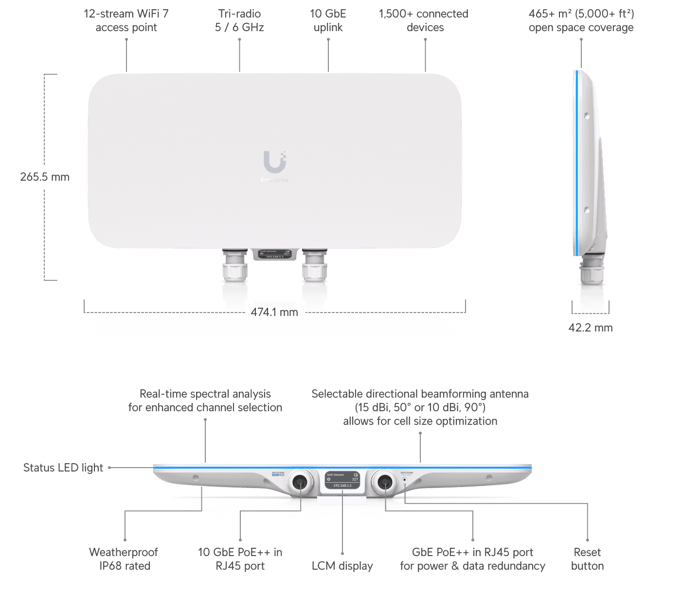 Selectable directional beamforming antenna (15 dBi, 50° or 11 dBi, 90°) allows for cell size optimization