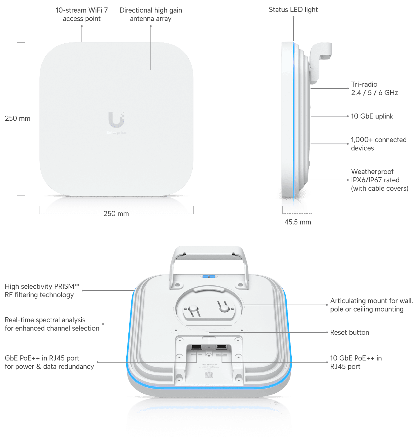 Enterprise-grade indoor/outdoor access point with ‎ 10-stream‎ ‎‎ WiFi 7 performance, PRISM™ active RF filtering technology, and integrated directional antennas.