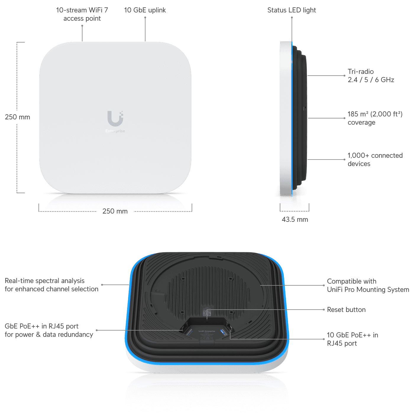 Enterprise-grade indoor access point with 10-stream WiFi 7 performance, a 10 GbE uplink, and a redundant GbE port for high availability.