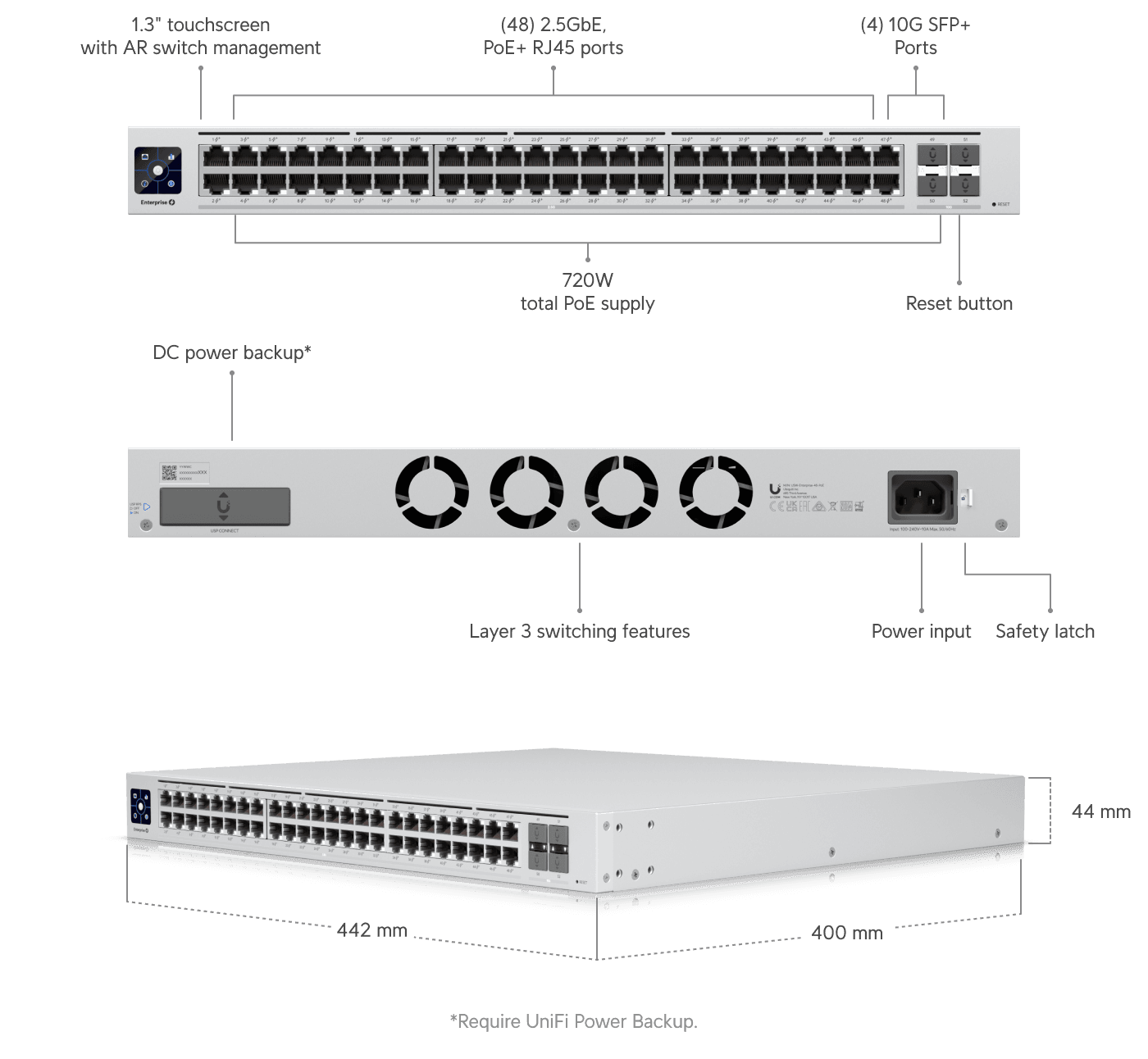 A 48-port, Layer 3 switch with 2.5 GbE PoE+ output.