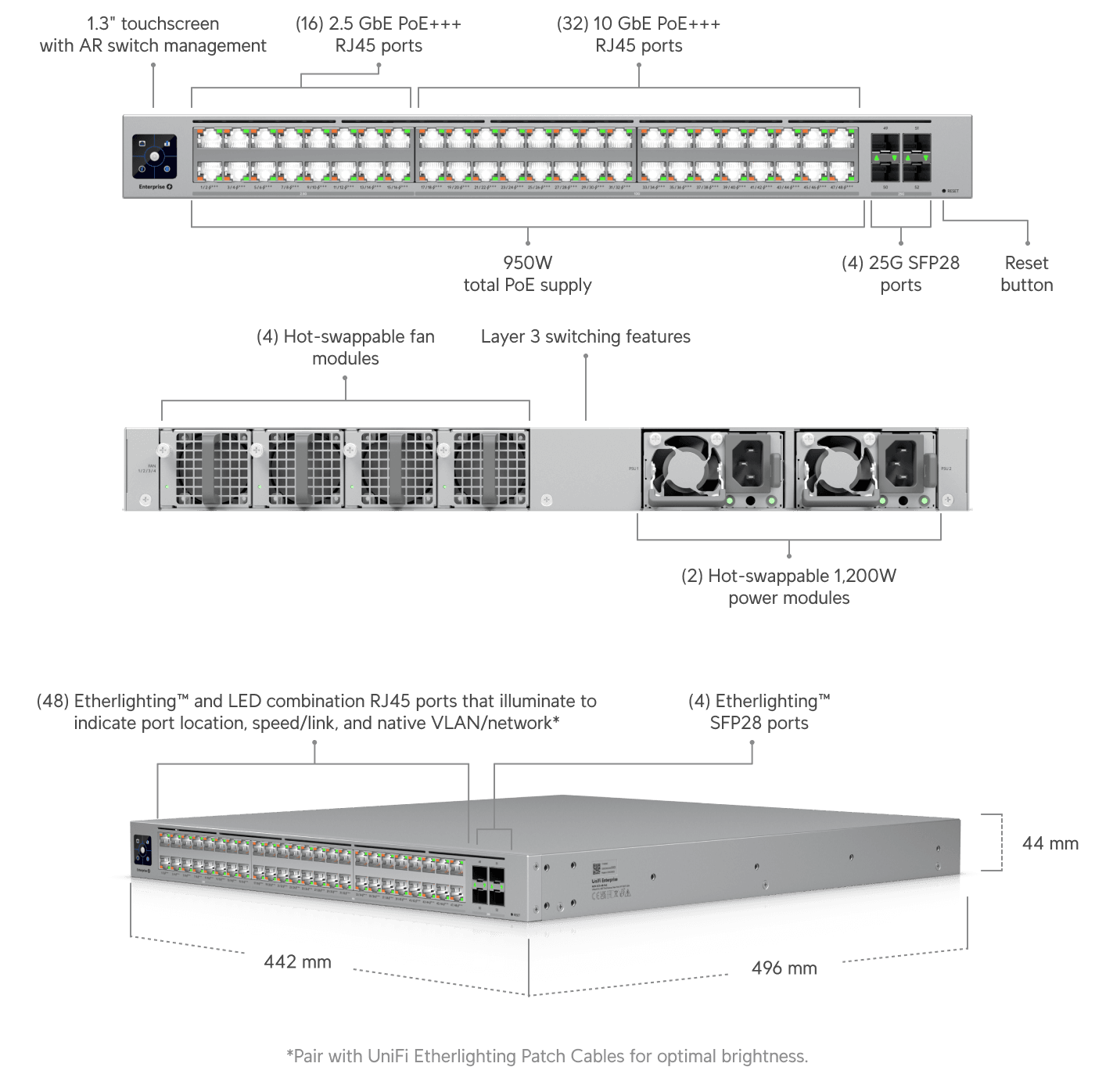 Enterprise-grade 48-port, Layer 3 Etherlighting™ PoE+++ switch with high-capacity 10 GbE RJ45 and 25G SFP28 connections for high availability system design.