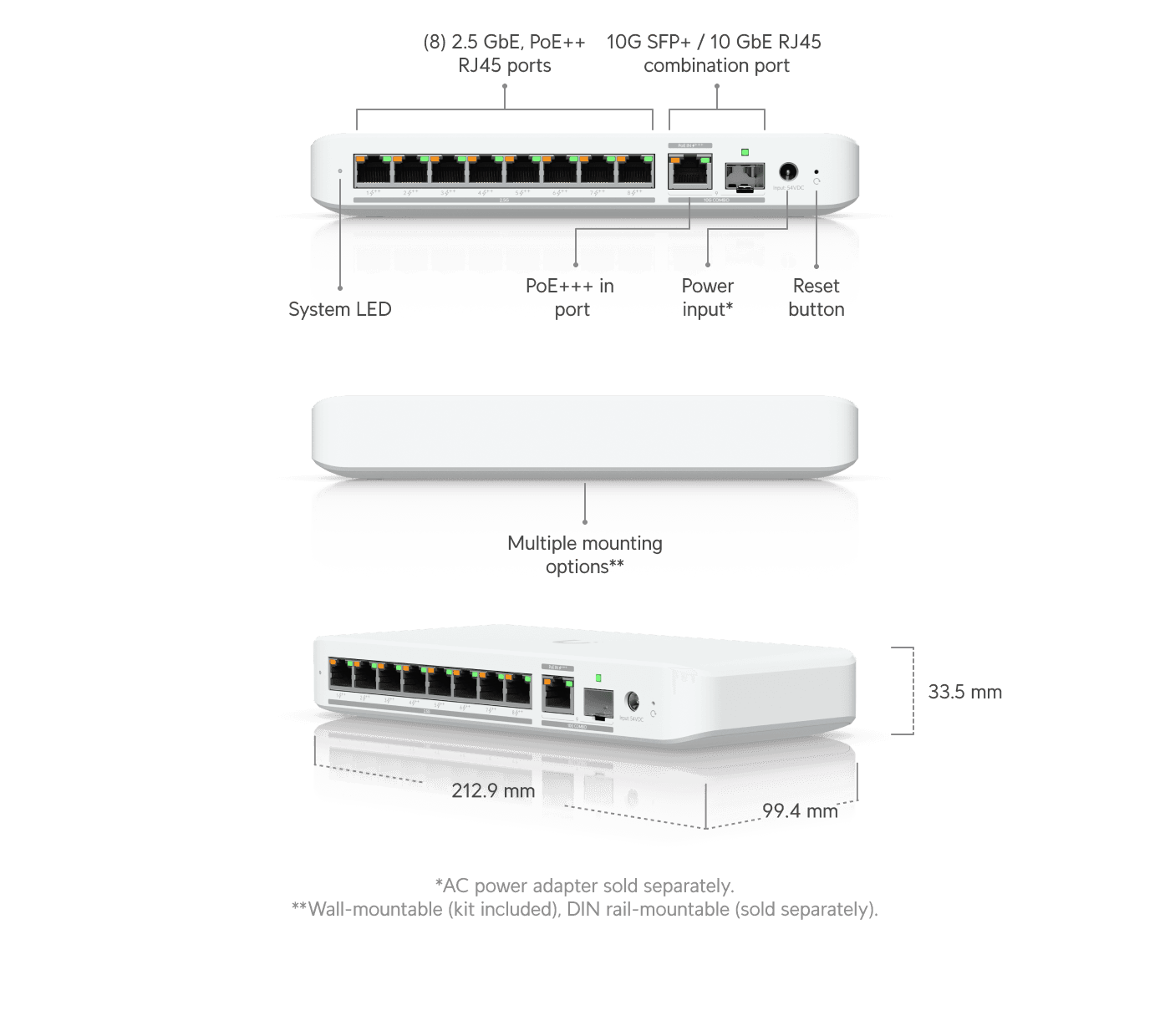 Flexible, 8-port 2.5 GbE PoE++ switch with a 10 GbE RJ45/SFP+ combination uplink port that can be powered with PoE+++ or an AC power adapter*.