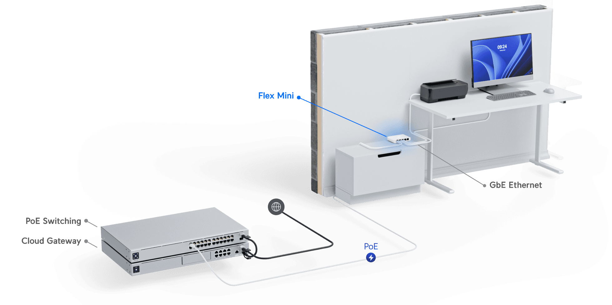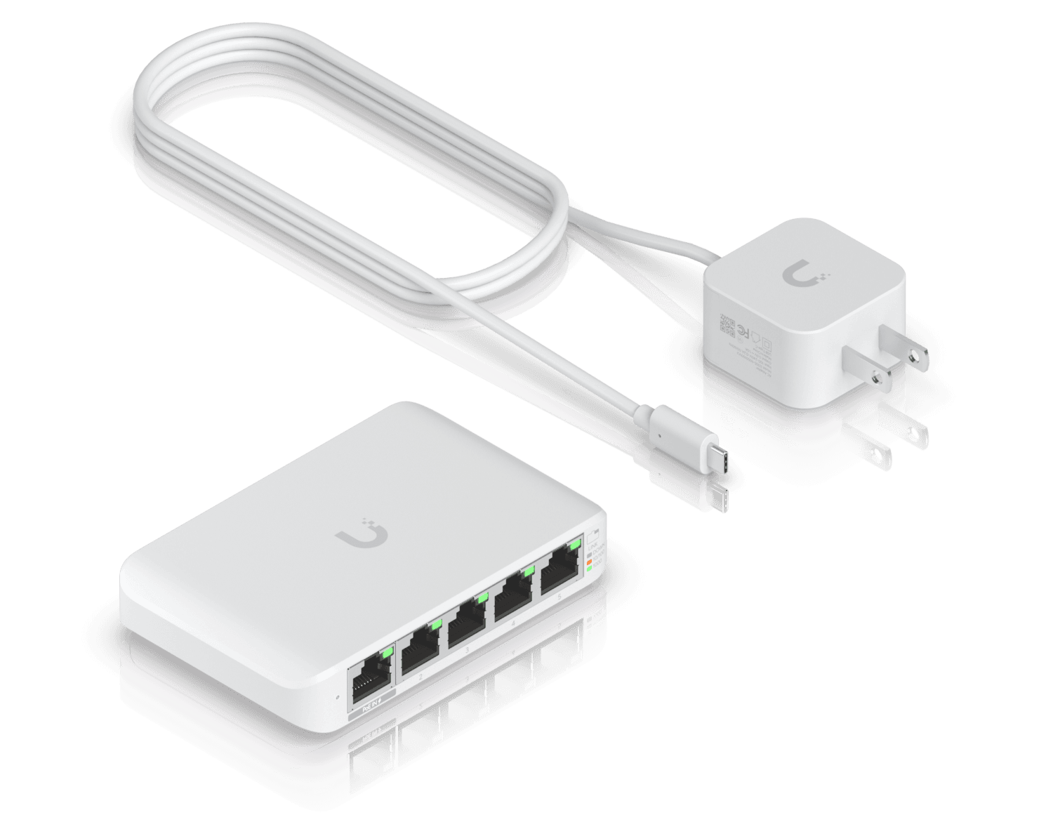 A compact, 5-port, Layer 2 switch that can be powered with PoE or a 5V USB-C adapter.