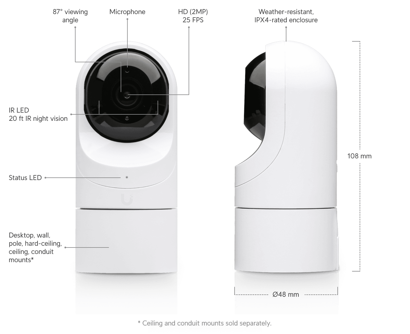 Full HD (1080p) mini turret camera with infrared LEDs and versatile mounting options for indoor and outdoor installations.