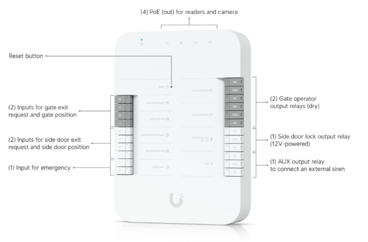 Connect up to four UniFi Access readers or UniFi Protect cameras