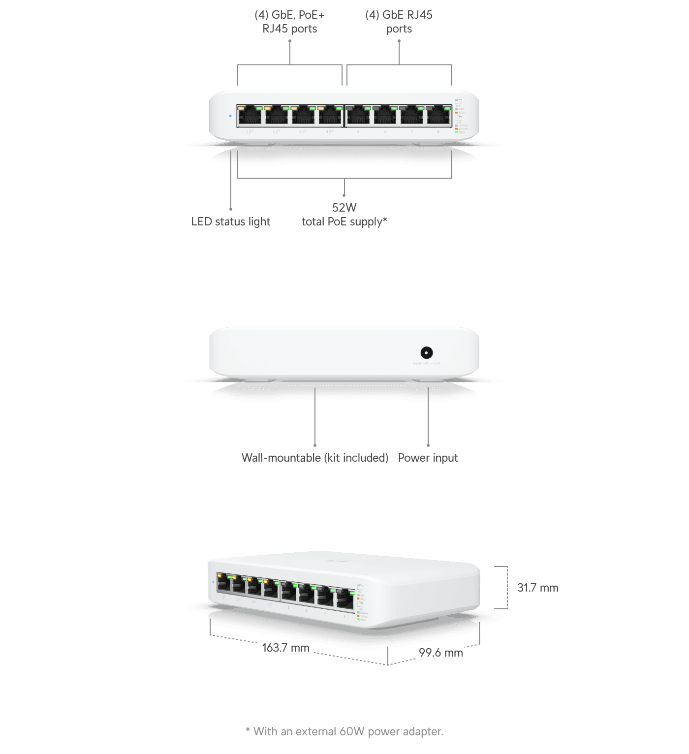 A compact, 5-port, Layer 2 switch that can be powered with PoE or a 5V USB-C adapter.