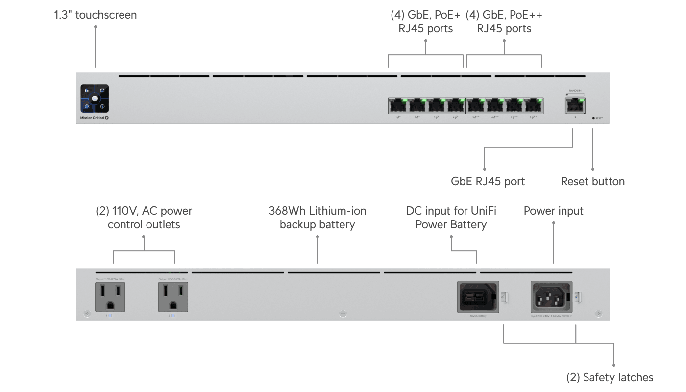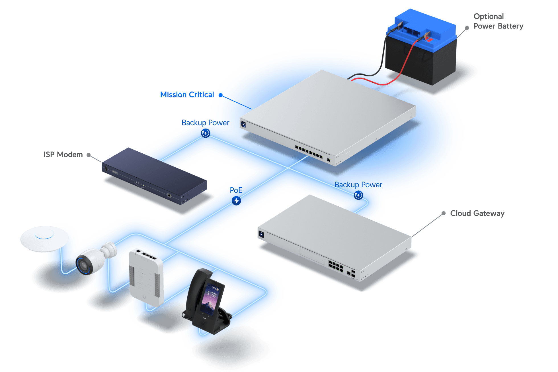 A switch with an integrated 368Wh lithium-ion battery capable of providing uninterruptible PoE to 8 devices.