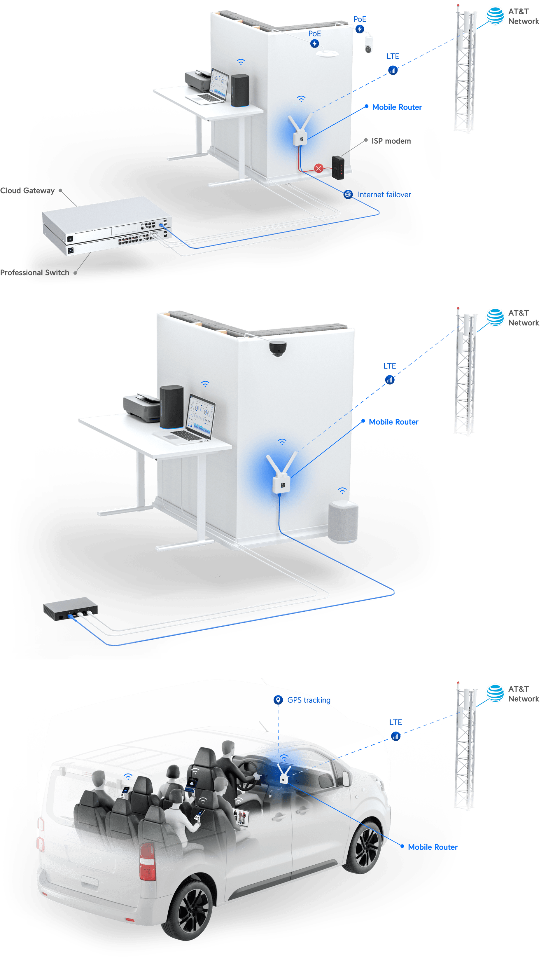 *Works with the AT&T network in the United States. LTE data plan options with the pre-installed AT&T SIM are $15/month for 1 GB, $30/month for 5 GB, or $70/month for 20 GB of data, plus $15 for each additional GB. Bring your own AT&T SIM with device version 1.5.0 and later; update out-of-the-box using the pre-installed SIM’s free trial or with wired WAN.