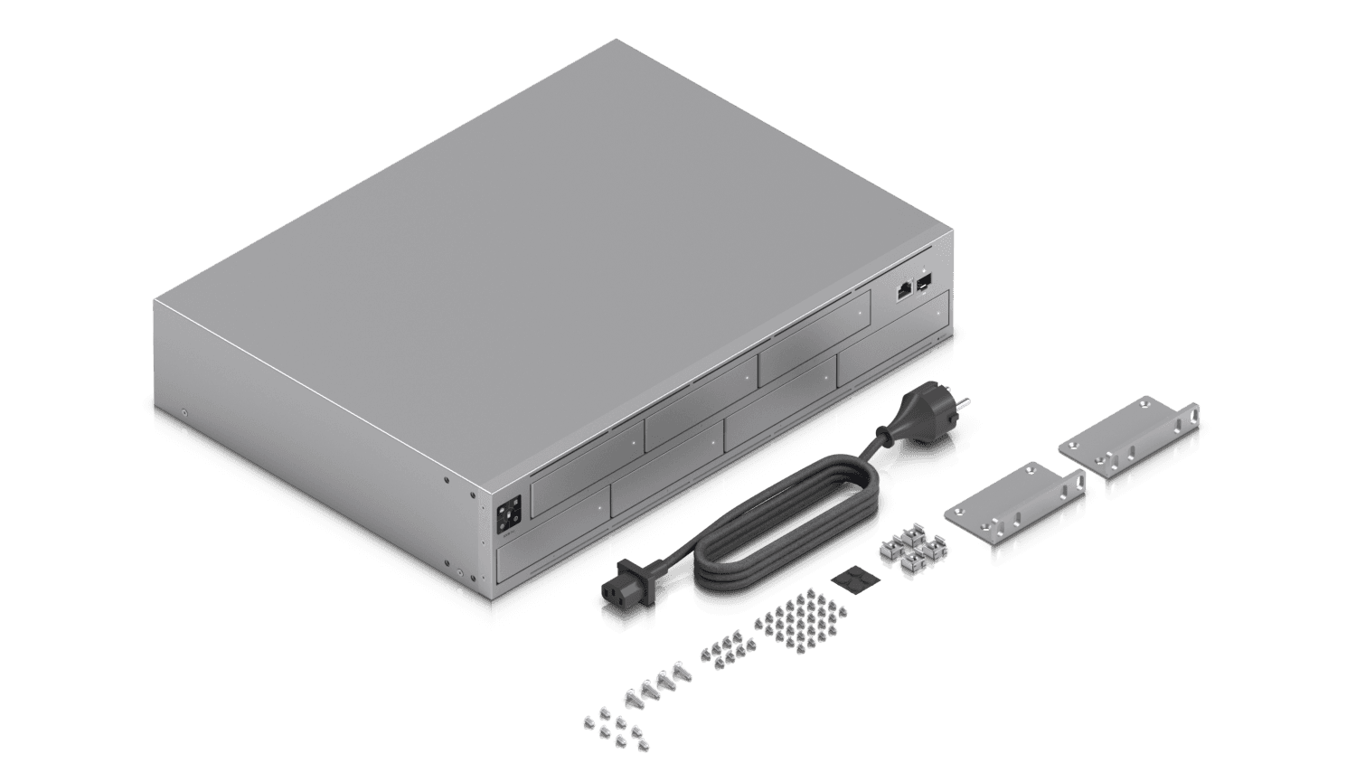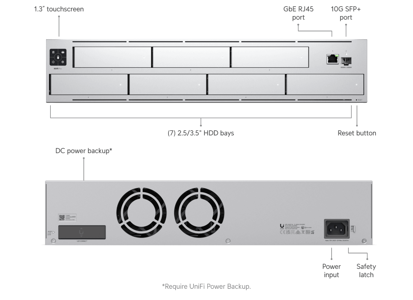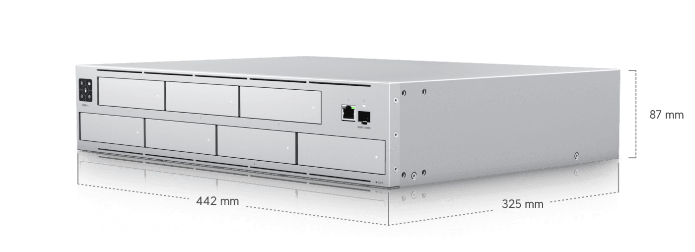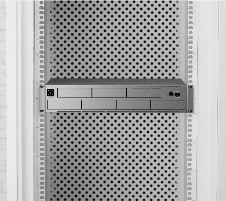 A 2U-sized video recorder with (7) 2.5/3.5″ HDD bays that can provide up to 60 days of storage for (24) 4K cameras or