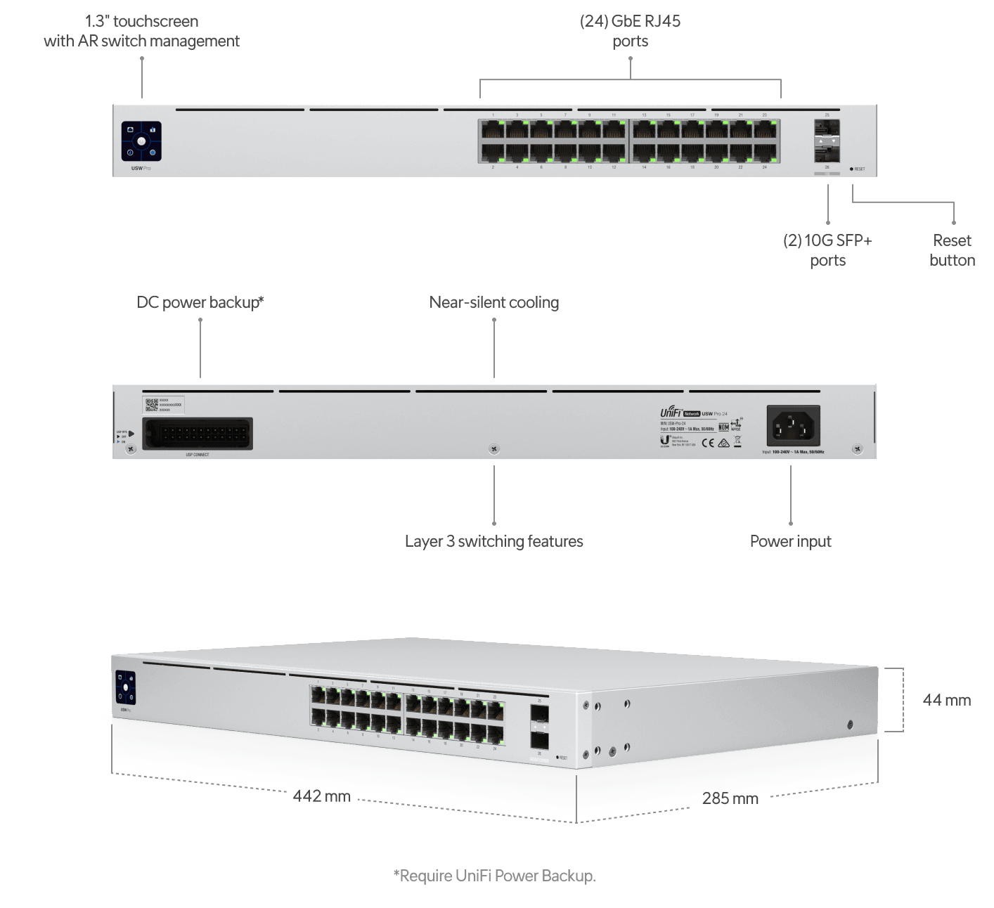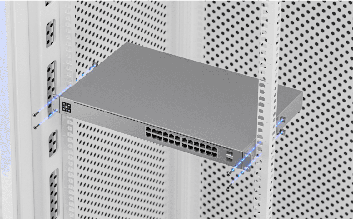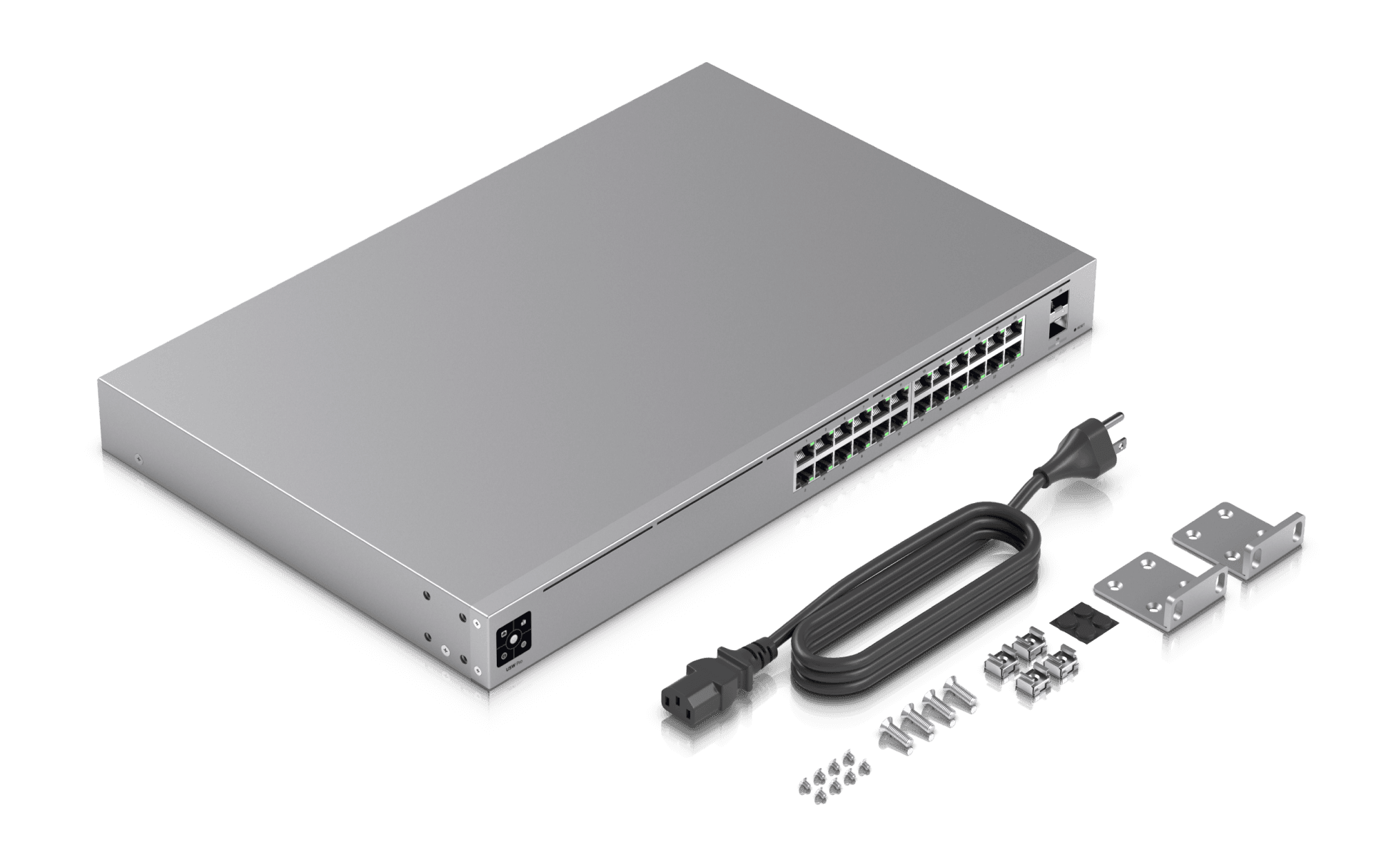 A 24-port, Layer 3 switch supporting 10G SFP+ connections with fanless cooling.