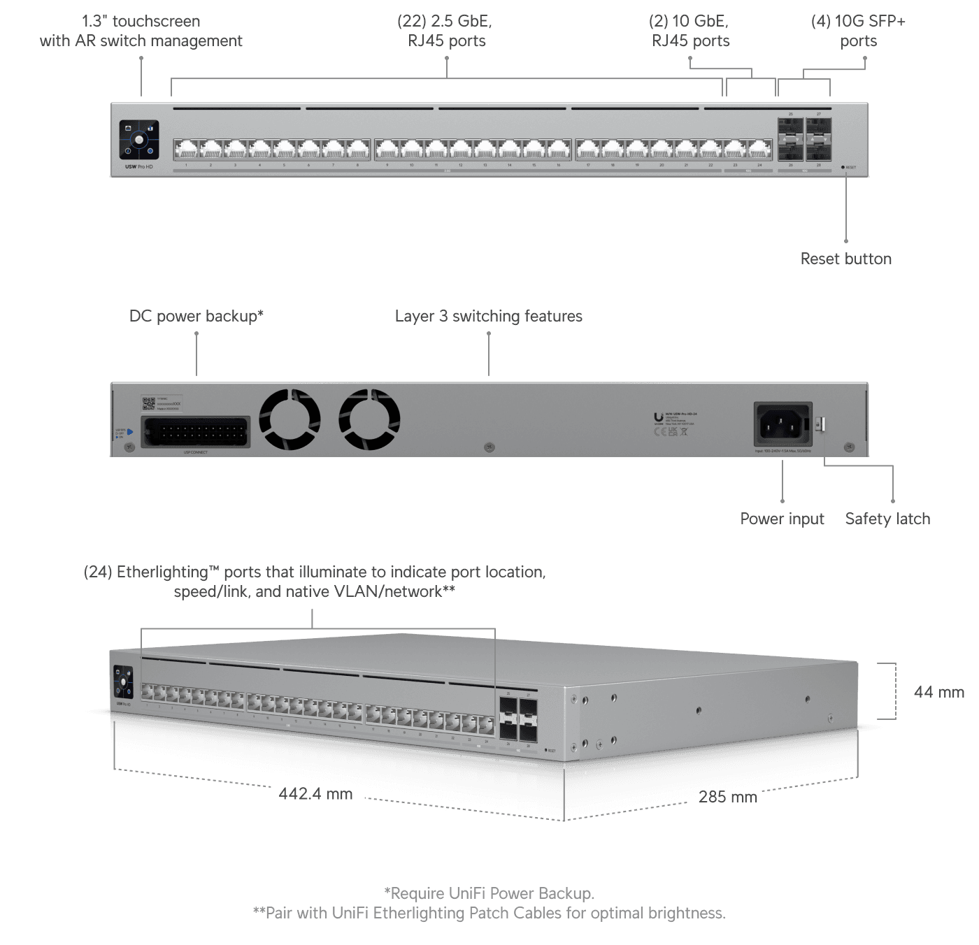 Professional-grade, Layer 3 Etherlighting™ switch with (2) 10 GbE, (22) 2.5 GbE, and (4) 10G SFP+ ports.