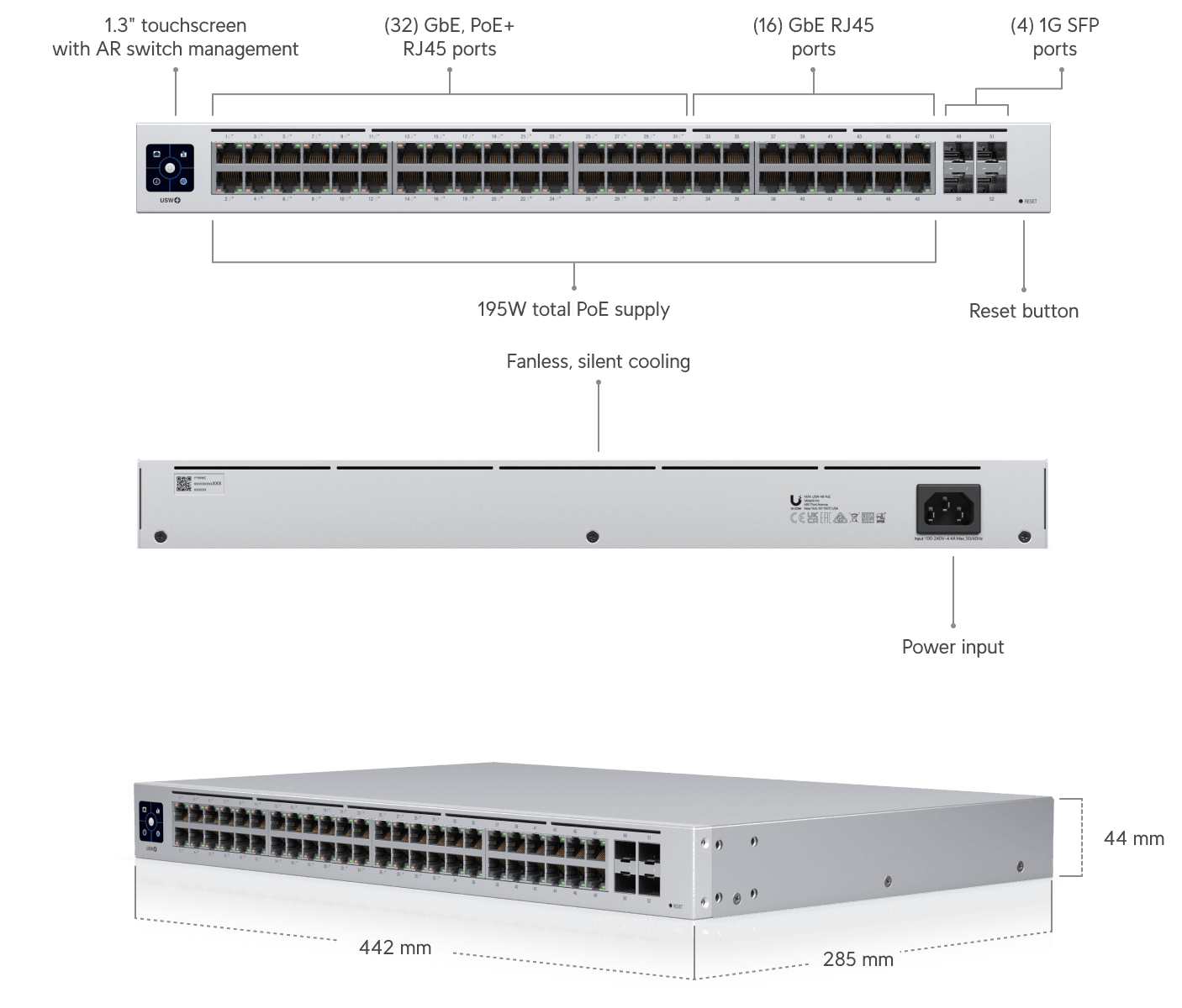 A 48-port, Layer 2 PoE switch with a silent, fanless cooling system.