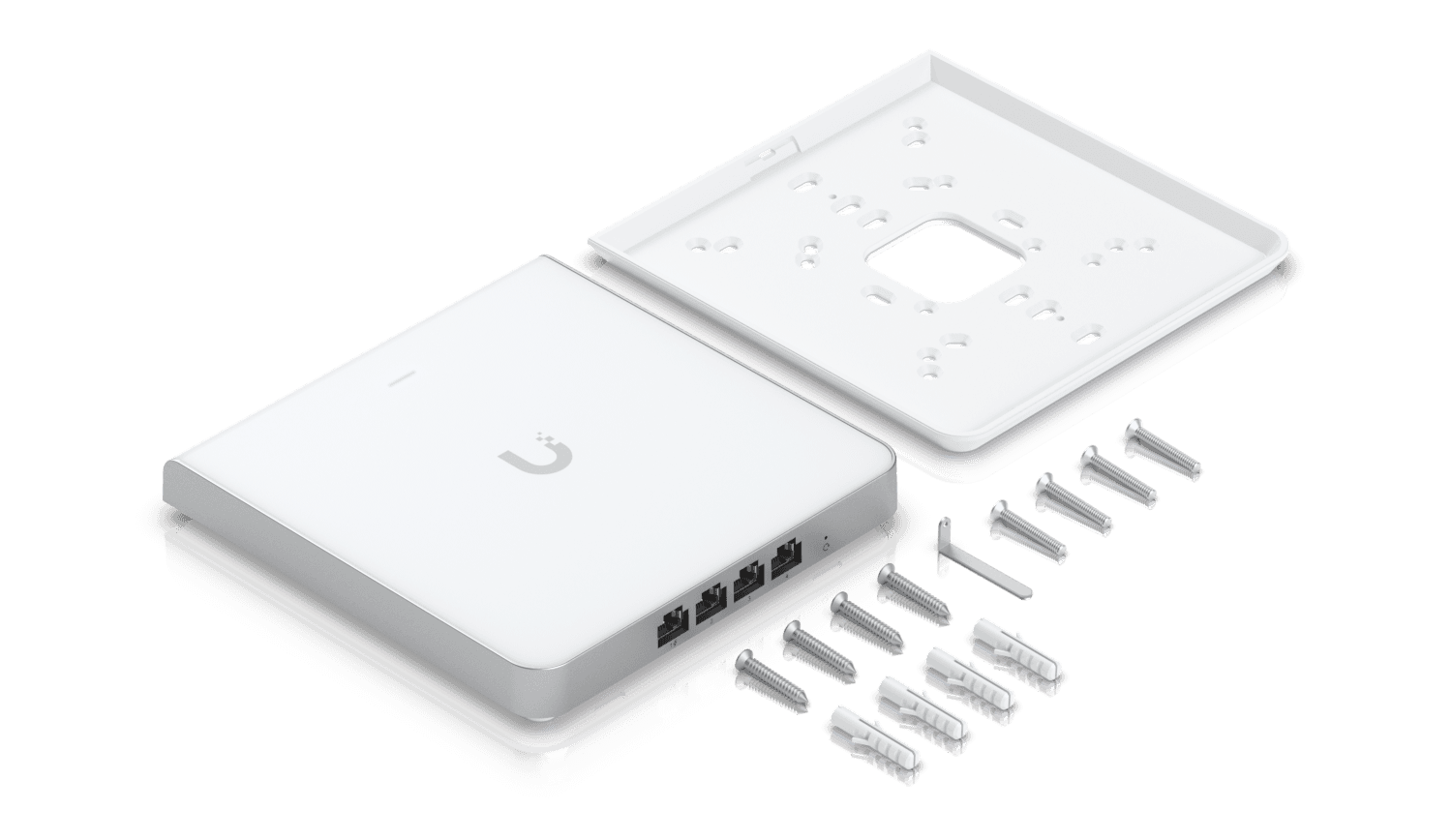 Wall-mounted WiFi 6E AP with 10 spatial streams, 6 GHz support, and a built-in 4-port switch. Designed for high-density office networks.