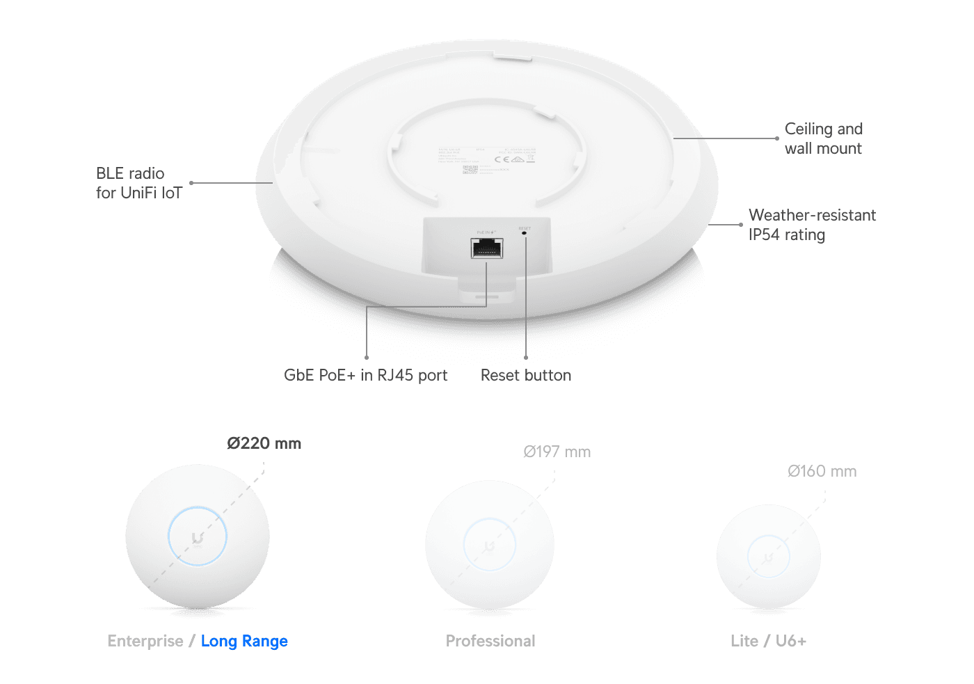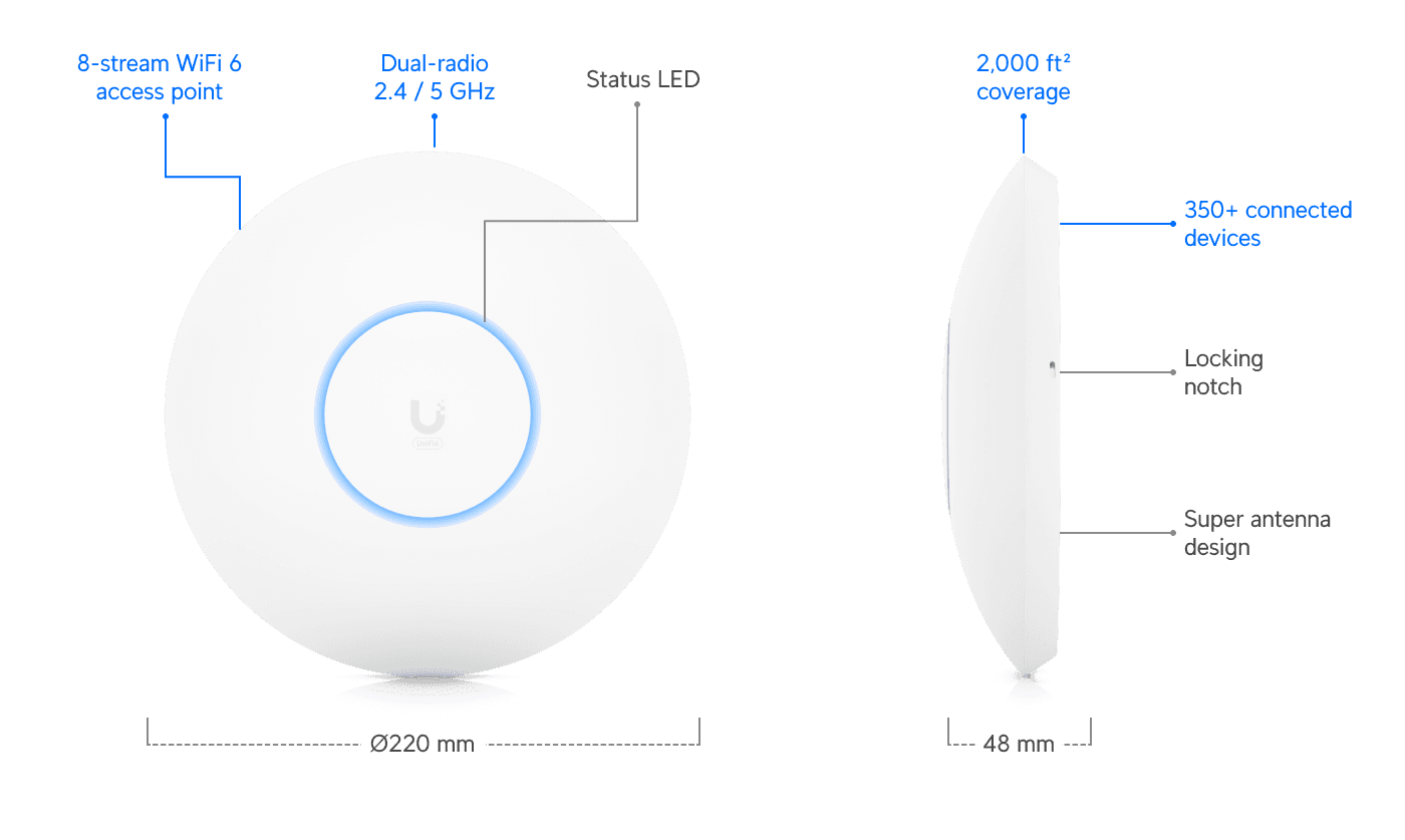 Ceiling-mounted WiFi 6 AP with 8 spatial streams and extended signal range.