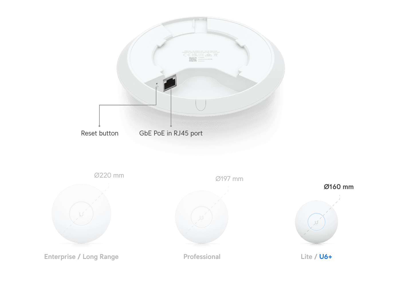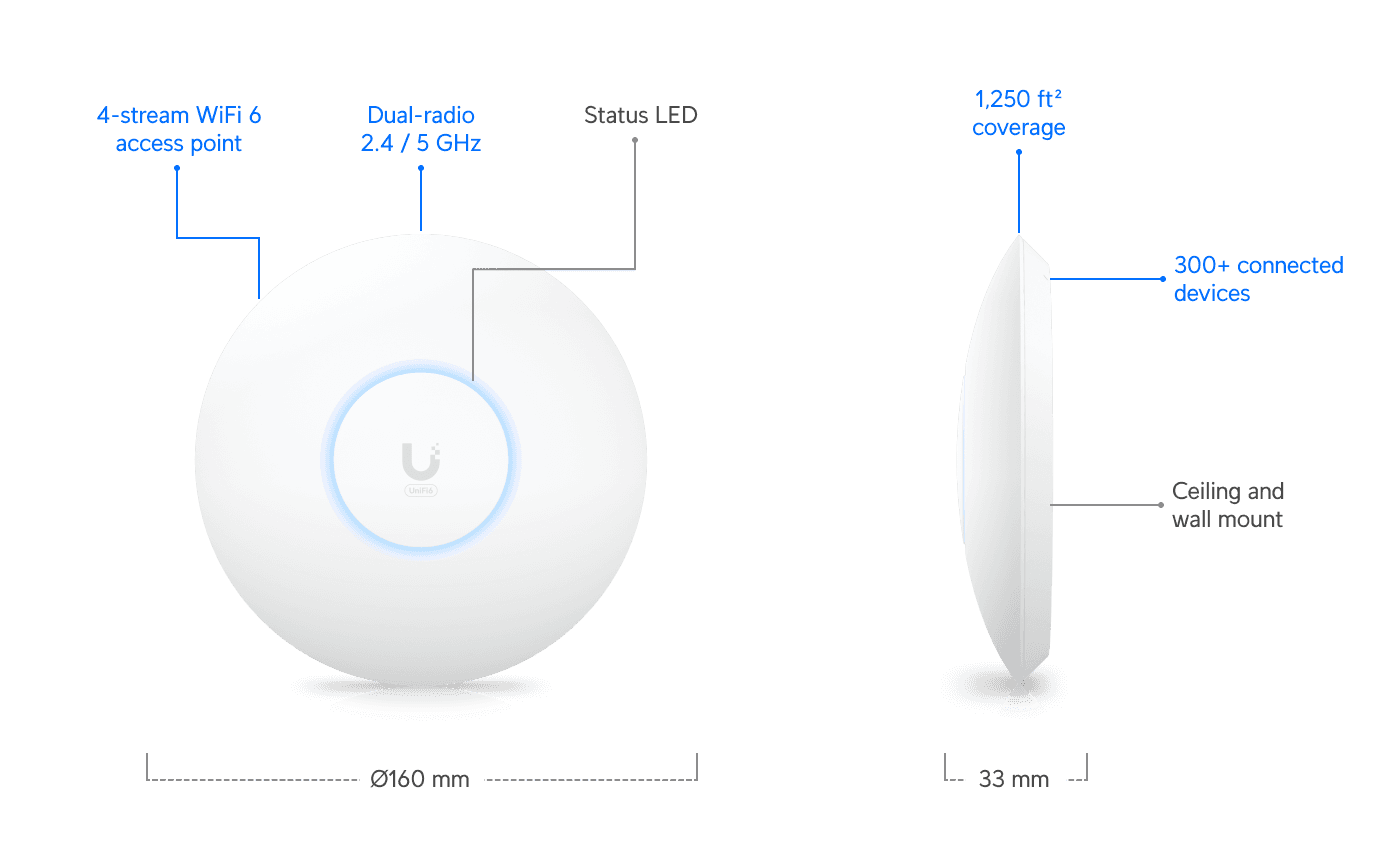 Compact, ceiling-mounted WiFi 6 AP with 4 spatial streams that improves upon the U6 Lite with higher performance and dual-band WiFi 6 support. Ideal for small and medium-sized businesses.