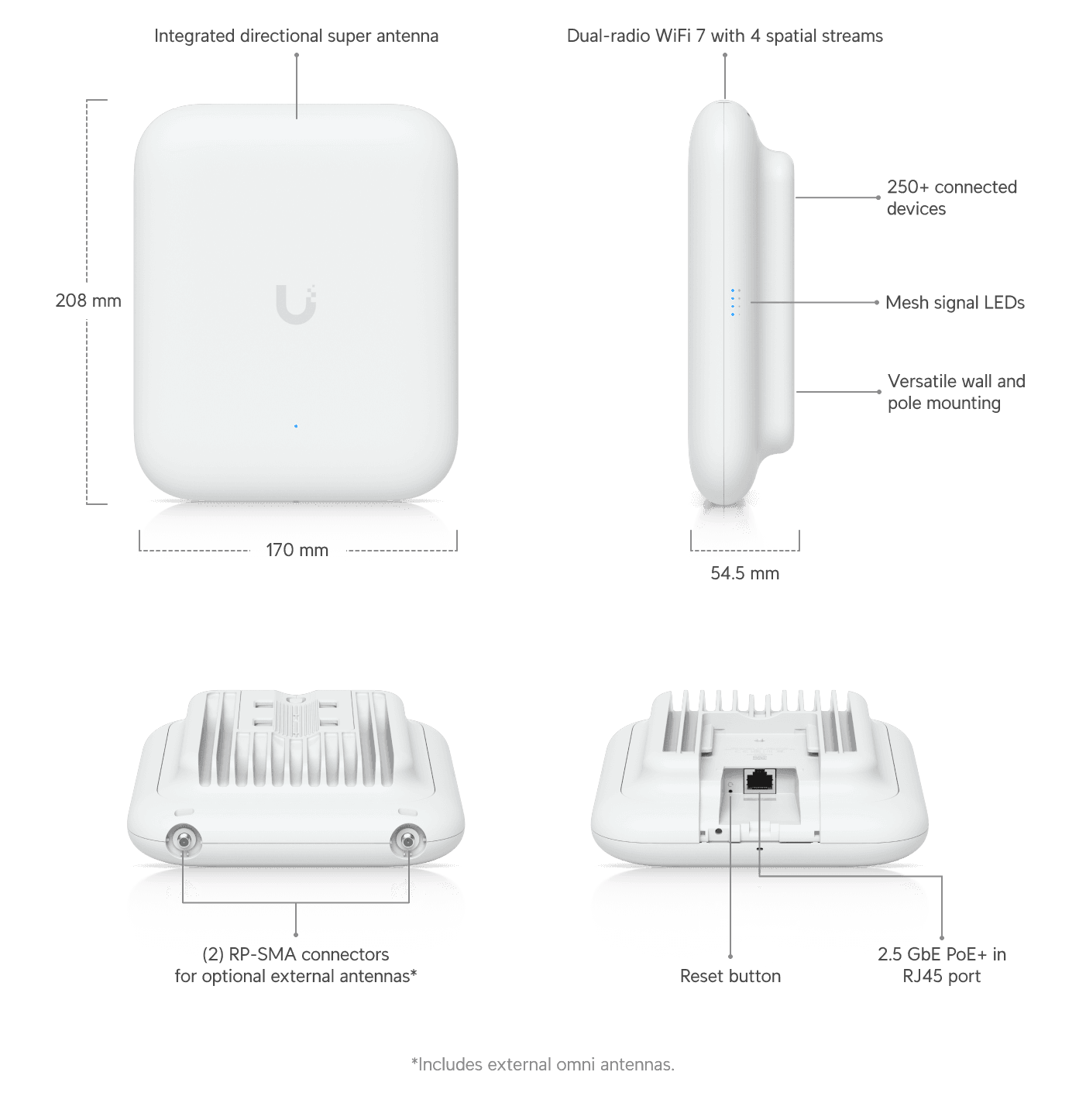 All-weather WiFi 7 AP with 4 spatial streams, an integrated directional super antenna, and versatile mounting options.