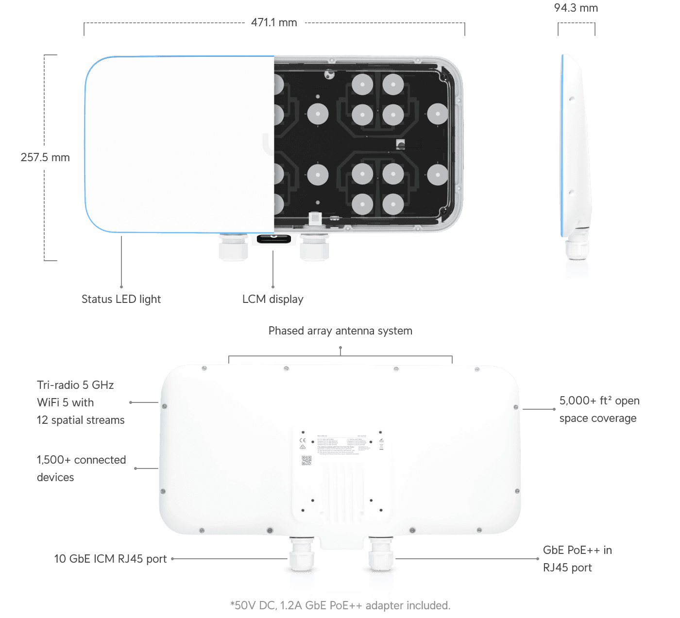 Tri-radio WiFi 5 AP with 12 spatial streams and a selectable beamforming antenna, designed for high-density applications at large venues.
